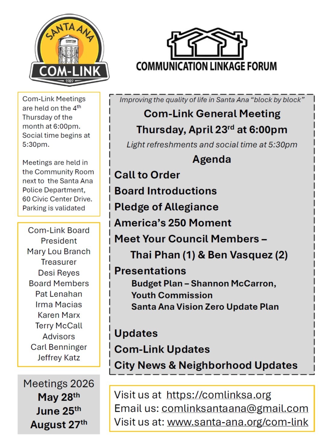 Com-Link was formed in July 1989, for the purpose of providing a non-partisan forum to promote the exchange of ideas and information between neighborhoods and community leaders. Com-Link partners with the City of Santa Ana in order to communicate the positive aspects of Santa Ana and to enhance a sense of community. Com-Link, originally comprised of five neighborhood associations, now represents over 60 Santa Ana neighborhood associations. The most valuable aspect of Com-Link is that it allows many sides of an issue to be expressed. Com-Link also provides a networking forum for community leaders to develop contacts in order to address issues that need to be taken beyond the forum, and acted upon by an individual or by neighborhoods.